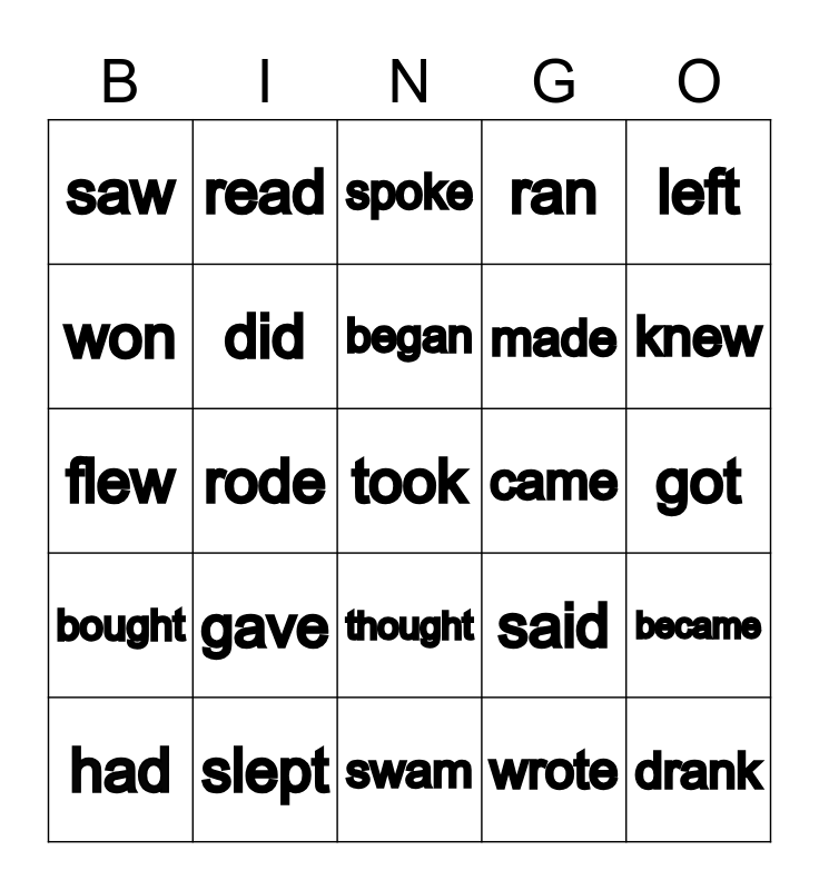 This bingo card has a free space and 29 words: had, went, rode, ate, saw, spoke, did, gave, came, slept, got, drank, swam, wrote, knew, saw, thought, bought, left, flew, said, came, made, won, ran, read, became, began and put.