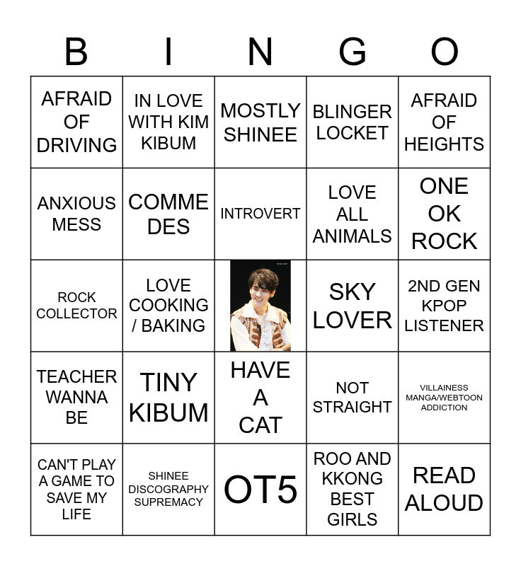 This bingo card has a free space and 24 words: TINY KIBUM, SHINEE DISCOGRAPHY SUPREMACY, INTROVERT, CAN'T PLAY A GAME TO SAVE MY LIFE, AFRAID OF HEIGHTS, AFRAID OF DRIVING, ANXIOUS MESS, IN LOVE WITH KIM KIBUM, SKY LOVER, HAVE A CAT, LOVE ALL ANIMALS, ROCK COLLECTOR, NOT STRAIGHT, VILLAINESS MANGA/WEBTOON ADDICTION, COMME DES, ROO AND KKONG BEST GIRLS, 2ND GEN KPOP LISTENER, MOSTLY SHINEE, ONE OK ROCK, LOVE COOKING / BAKING, READ ALOUD, TEACHER WANNA BE, BLINGER LOCKET and OT5.