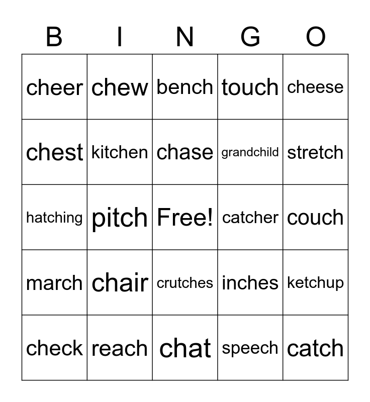 This bingo card has a free space and 25 words: chair, chat, chase, check, cheese, cheer, chest, chew, catcher, crutches, grandchild, hatching, inches, ketchup, kitchen, beach, couch, bench, stretch, pitch, catch, reach, march, touch and speech.
