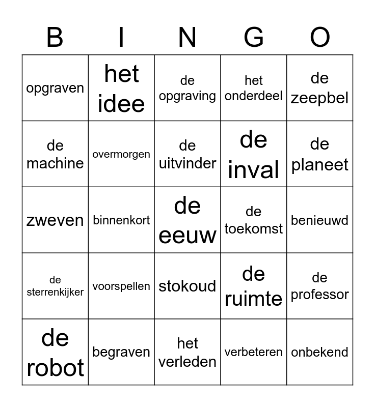This bingo card has 30 words: begraven, bewaren, binnenkort, eergisteren, opgraven, de opgraving, overmorgen, stokoud, de toekomst, het verleden, benieuwd, de eeuw, verbeteren, onbekend, de planeet, de raket, de ruimte, de sterrenkijker, voorspellen, de zeepbel, zweven, het apparaat, het idee, de inval, de machine, het onderdeel, de professor, de robot, de uitvinder and de uitvinding.