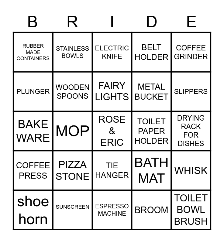 This bingo card has a free space and 24 words: PIZZA STONE, SUNSCREEN, FAIRY LIGHTS, shoe horn, COFFEE GRINDER, RUBBER MADE CONTAINERS, PLUNGER, STAINLESS BOWLS, TOILET PAPER HOLDER, TIE HANGER, METAL BUCKET, BAKE WARE, BATH MAT, WHISK, WOODEN SPOONS, BROOM, DRYING RACK FOR DISHES, ELECTRIC KNIFE, SLIPPERS, MOP, TOILET BOWL BRUSH, COFFEE PRESS, BELT HOLDER and ESPRESSO MACHINE.