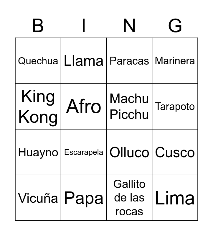 This bingo card has 32 words: Perú, Ceviche, Cusco, Arroz con Leche, Lima, Machu Picchu, King Kong, Punta Sal, Llama, Mancora, Tarapoto, Paracas, Ica, Nasca, Papa, Trujillo, Arándano, Olluco, Pollo a la Brasa, Inca Kola, Cóndor Andino, Perro Peruano, Gallito de las rocas, Cuy, Vicuña, Marinera, Huayno, Afro, Quechua, Historia del arte Peruano, Textiles Peruanos and Escarapela.