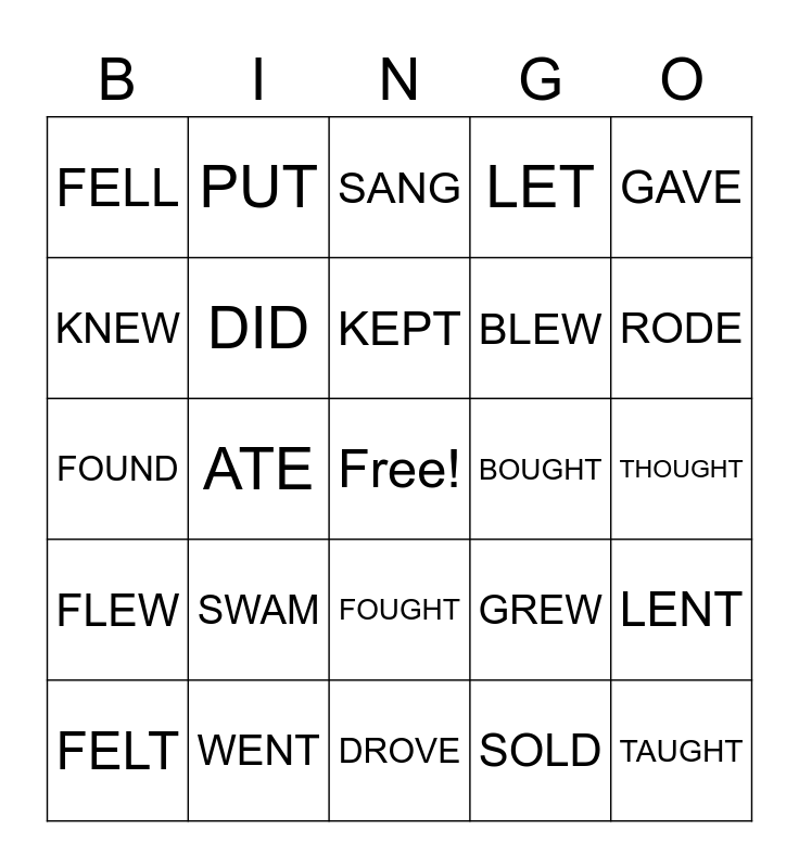 This bingo card has a free space and 29 words: FELT, STOOD, ATE, DRANK, FELL, SANG, DID, SWAM, BOUGHT, WENT, THOUGHT, TAUGHT, DROVE, SOLD, RODE, WAS/WERE, FOUGHT, FLEW, GAVE, FOUND, GREW, BROKE, BLEW, KNEW, LET, PUT, LENT, KEPT and HIT.
