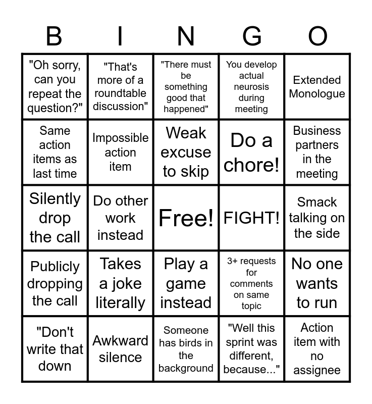 This bingo card has a free space and 24 words: Takes a joke literally, Awkward silence, Weak excuse to skip, "Don't write that down, Extended Monologue, "Oh sorry, can you repeat the question?", Same action items as last time, "That's more of a roundtable discussion", FIGHT!, Play a game instead, Do a chore!, Silently drop the call, 3+ requests for comments on same topic, No one wants to run, Impossible action item, "Well this sprint was different, because...", Smack talking on the side, "There must be something good that happened", Business partners in the meeting, Do other work instead, Action item with no assignee, Publicly dropping the call, You develop actual neurosis during meeting and Someone has birds in the background.