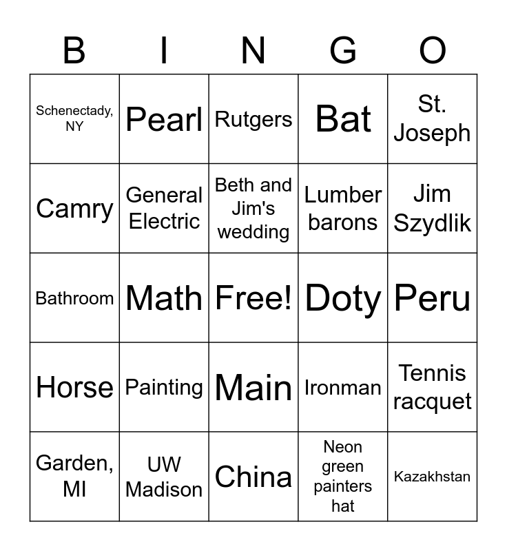 This bingo card has a free space and 30 words: UW Madison, 6 days, Math, New Brunswick, NJ, Schenectady, NY, Rutgers, General Electric, Main, Doty, China, Peru, Kazakhstan, Neon green painters hat, Nick Johnson, Jim Szydlik, Turkey, Ironman, Horse, Painting, St. Joseph, Bathroom, Gail, Pearl, Lumber barons, Camry, Bat, Tennis racquet, Garden, MI, Beth and Jim's wedding and Chickens.