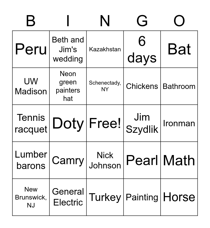 This bingo card has a free space and 30 words: General Electric, Main, Doty, China, Peru, Kazakhstan, Neon green painters hat, Nick Johnson, Jim Szydlik, Turkey, Ironman, Horse, Painting, St. Joseph, Bathroom, Gail, Pearl, Lumber barons, Camry, Bat, Tennis racquet, Garden, MI, Beth and Jim's wedding, Chickens, UW Madison, 6 days, Math, New Brunswick, NJ, Schenectady, NY and Rutgers.