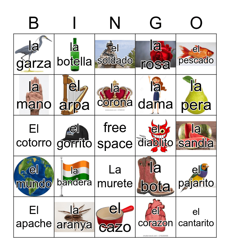 This bingo card has 42 images, a free space and 52 words: la campana, el cantarito, el venado, el cazo, la bandera, el barril, la botella, la escalera, la mano, la rana, el arpa, la maceta, el pajarito, la bota, el nopal, el melon, la corona, el diablito, el tambor, el pescado, el gorrito, el corazon, la garza, la dama, la sirena, la luna, el musico, la palma, la pera, el pino, el gallo, la rosa, el alacran, el camaron, la calavera, el soldado, la aranya, la estrella, el sol, el arbol, el paraguas, la sandia, el mundo, El catrin, La murete, El bandolon, El cello, El cotorro, El negrito, Las jaras, El apache and La chalupa.