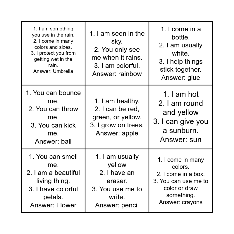 This bingo card has 9 words: 1. You can smell me. 2. I am a beautiful living thing. 3. I have colorful petals. Answer: Flower, 1. I am healthy. 2. I can be red, green, or yellow. 3. I grow on trees. Answer: apple, 1. I come in a bottle. 2. I am usually white. 3. I help things stick together. Answer: glue, 1. I am something you use in the rain. 2. I come in many colors and sizes. 3. I protect you from getting wet in the rain. Answer: Umbrella, 1. I am seen in the sky. 2. You only see me when it rains. 3. I am colorful. Answer: rainbow, 1. I am hot 2. I am round and yellow 3. I can give you a sunburn. Answer: sun, 1. You can bounce me. 2. You can throw me. 3. You can kick me. Answer: ball, 1. I am usually yellow 2. I have an eraser. 3. You use me to write. Answer: pencil and 1. I come in many colors. 2. I come in a box. 3. You can use me to color or draw something. Answer: crayons.