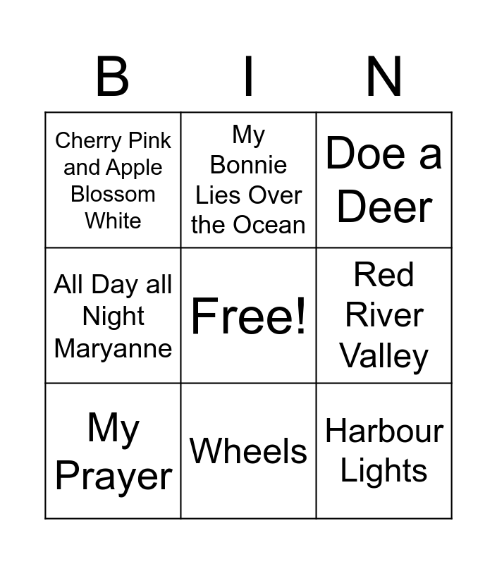 This bingo card has 26 words: Yellow Rose of Texas, This Land is Your Land, Wheels, Island in the Sun, Free!, Cherry Pink and Apple Blossom White, Red River Valley, My Bonnie Lies Over the Ocean, Daisy Daisy, Red Sails in the Sunset, Harbour Lights, Pearly Shells, Valderi Valdera, It's a Long Way to Tipperary, Smile the While, Down by the Riverside, All Day all Night Maryanne, When Irish Eyes are Smiling, Doe a Deer, Never on a Sunday, Autumn Leaves, Mona Lisa, The Tennessee Waltz, Whispering Hope, My Prayer and Summer Holiday.