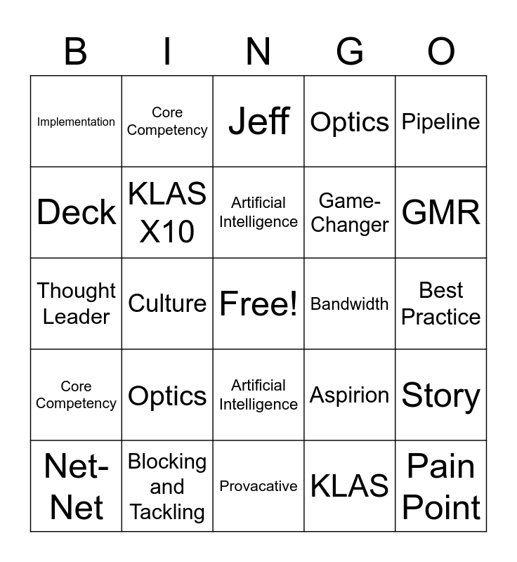 This bingo card has a free space and 29 words: Net-Net, QBR, Culture, Cross Sell, Implementation, Jeff, KLAS X10, Optics, Bandwidth, Blocking and Tackling, Best Practice, Pain Point, Provacative, KLAS, GMR, Machine Learning, Artificial Intelligence, Core Competency, Pipeline, Thought Leader, Aspirion, Story, Game-Changer, Deck, Optics, Core Competency, Story, Artificial Intelligence and Game-changer.