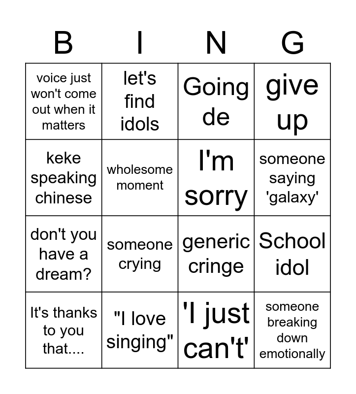 This bingo card has 16 words: "I love singing", School idol, Going de, voice just won't come out when it matters, don't you have a dream?, let's find idols, generic cringe, 'I just can't', keke speaking chinese, wholesome moment, It's thanks to you that...., give up, someone crying, someone saying 'galaxy', I'm sorry and someone breaking down emotionally.