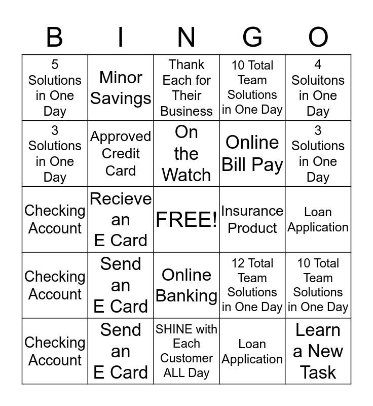 This bingo card has a free space and 24 words: Send an E Card, Send an E Card, On the Watch, Checking Account, 4 Soluitons in One Day, 5 Solutions in One Day, 3 Solutions in One Day, Minor Savings, Insurance Product, Online Banking, Online Bill Pay, Checking Account, 12 Total Team Solutions in One Day, 10 Total Team Solutions in One Day, Approved Credit Card, Loan Application, Loan Application, Thank Each for Their Business, 3 Solutions in One Day, Recieve an E Card, Learn a New Task, Checking Account, 10 Total Team Solutions in One Day and SHINE with Each Customer ALL Day.