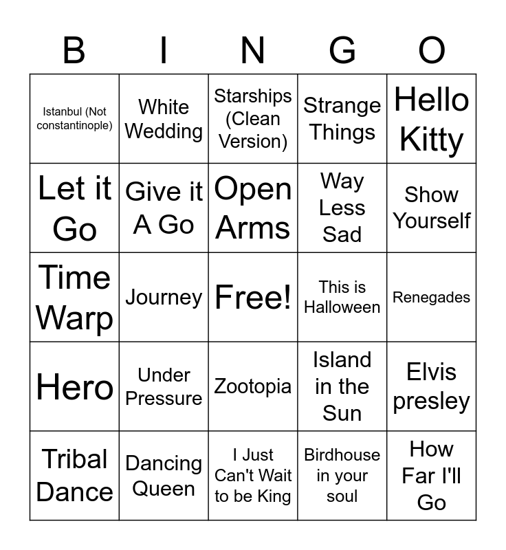 This bingo card has a free space and 24 words: Under Pressure, Dancing Queen, Open Arms, Tribal Dance, Hello Kitty, Istanbul (Not constantinople), Let it Go, White Wedding, This is Halloween, Zootopia, Way Less Sad, Time Warp, Island in the Sun, Elvis presley, Give it A Go, Birdhouse in your soul, Renegades, Starships (Clean Version), Show Yourself, Journey, How Far I'll Go, Hero, Strange Things and I Just Can't Wait to be King.