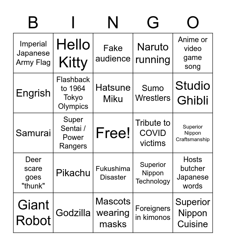 This bingo card has a free space and 24 words: Pikachu, Godzilla, Hatsune Miku, Giant Robot, Anime or video game song, Imperial Japanese Army Flag, Engrish, Hello Kitty, Tribute to COVID victims, Fukushima Disaster, Sumo Wrestlers, Samurai, Superior Nippon Technology, Hosts butcher Japanese words, Flashback to 1964 Tokyo Olympics, Foreigners in kimonos, Superior Nippon Craftsmanship, Fake audience, Studio Ghibli, Super Sentai / Power Rangers, Superior Nippon Cuisine, Deer scare goes "thunk", Naruto running and Mascots wearing masks.