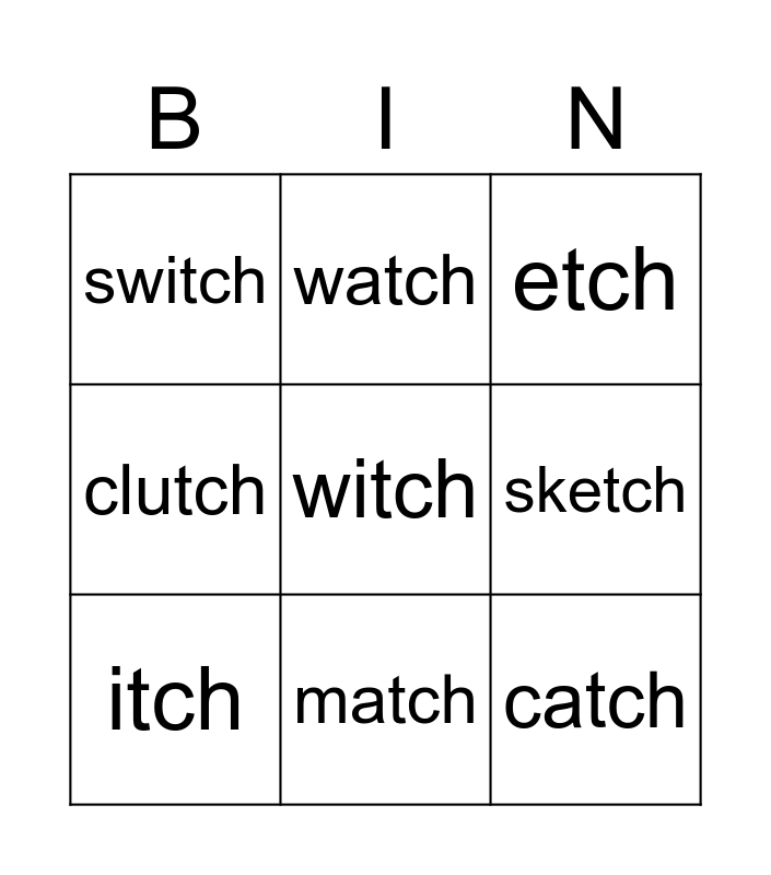 This bingo card has a free space and 8 words: sketch, etch, watch, itch, switch, catch, clutch and match.
