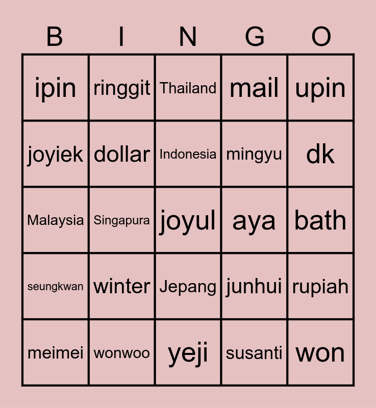 This bingo card has a free space and 24 words: winter, wonwoo, Indonesia, meimei, upin, ipin, joyiek, ringgit, aya, Jepang, mingyu, Malaysia, junhui, rupiah, dollar, susanti, bath, Thailand, dk, Singapura, won, seungkwan, mail and yeji.