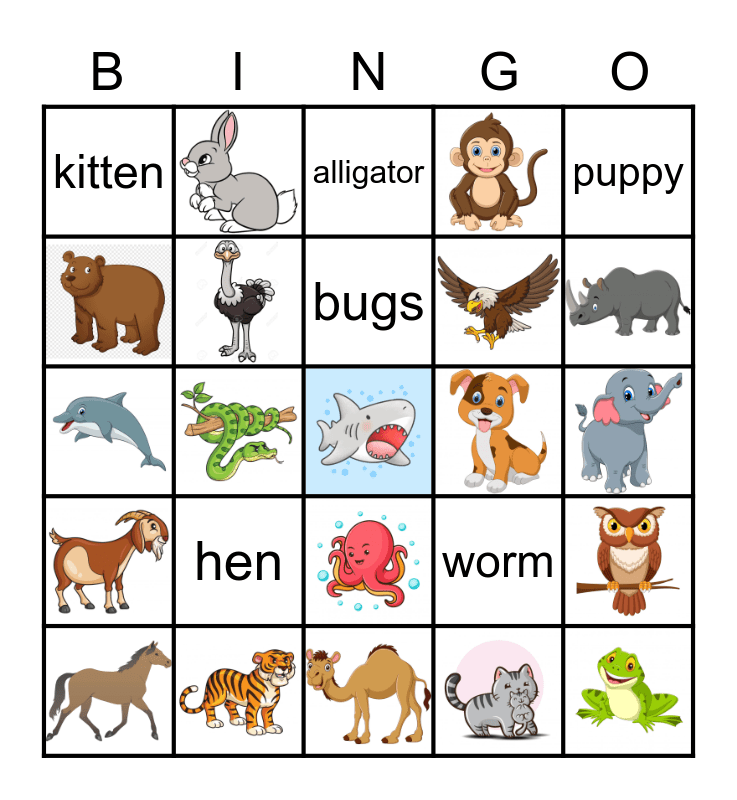 This bingo card has 24 images, a free space and 10 words: fish, hen, alligator, rooster, puppy, kitten, cow, bugs, worm and mouse.