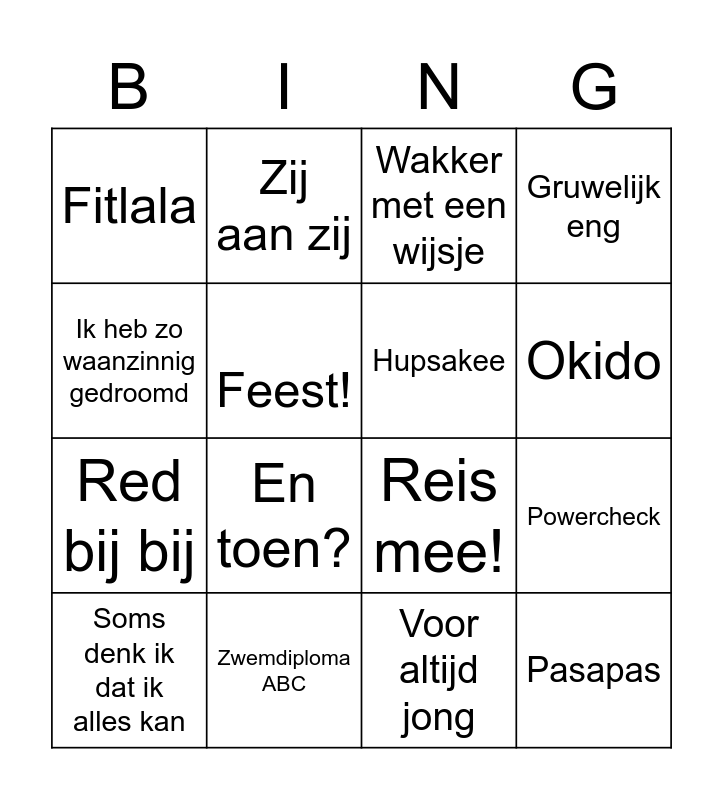 This bingo card has 20 words: Powercheck, Haai alarm, Wakker met een wijsje, Als ik de baas zou zijn, Soms denk ik dat ik alles kan, Ik heb zo waanzinnig gedroomd, Zwemdiploma ABC, Fitlala, Red bij bij, Zij aan zij, En toen?, Reis mee!, Feest!, Pasapas, Hupsakee, Klaar voor de start, Okido, Gruwelijk eng, Voor altijd jong and De tijger.