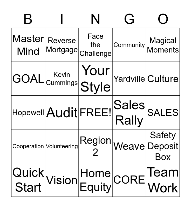 This bingo card has a free space and 24 words: Volunteering, Vision, Your Style, Quick Start, Magical Moments, Master Mind, GOAL, Reverse Mortgage, Sales Rally, Region 2, Yardville, Hopewell, Weave, Safety Deposit Box, Kevin Cummings, CORE, SALES, Face the Challenge, Culture, Audit, Team Work, Cooperation, Community and Home Equity.