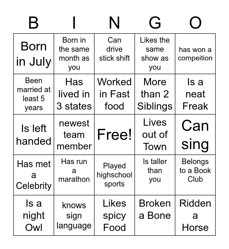 This bingo card has a free space and 24 words: Has run a marathon, knows sign language, Worked in Fast food, Is a night Owl, has won a compeition, Born in July, Been married at least 5 years, Born in the same month as you, Lives out of Town, Played highschool sports, More than 2 Siblings, Is left handed, Is taller than you, Belongs to a Book Club, Has lived in 3 states, Broken a Bone, Can sing, Can drive stick shift, Is a neat Freak, newest team member, Ridden a Horse, Has met a Celebrity, Likes the same show as you and Likes spicy Food.