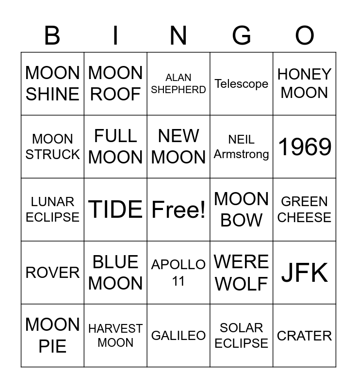 This bingo card has a free space and 24 words: BLUE MOON, HARVEST MOON, NEW MOON, MOON PIE, HONEY MOON, MOON SHINE, MOON STRUCK, MOON ROOF, MOON BOW, APOLLO 11, NEIL Armstrong, LUNAR ECLIPSE, WERE WOLF, JFK, FULL MOON, SOLAR ECLIPSE, GREEN CHEESE, ALAN SHEPHERD, 1969, TIDE, CRATER, ROVER, Telescope and GALILEO.