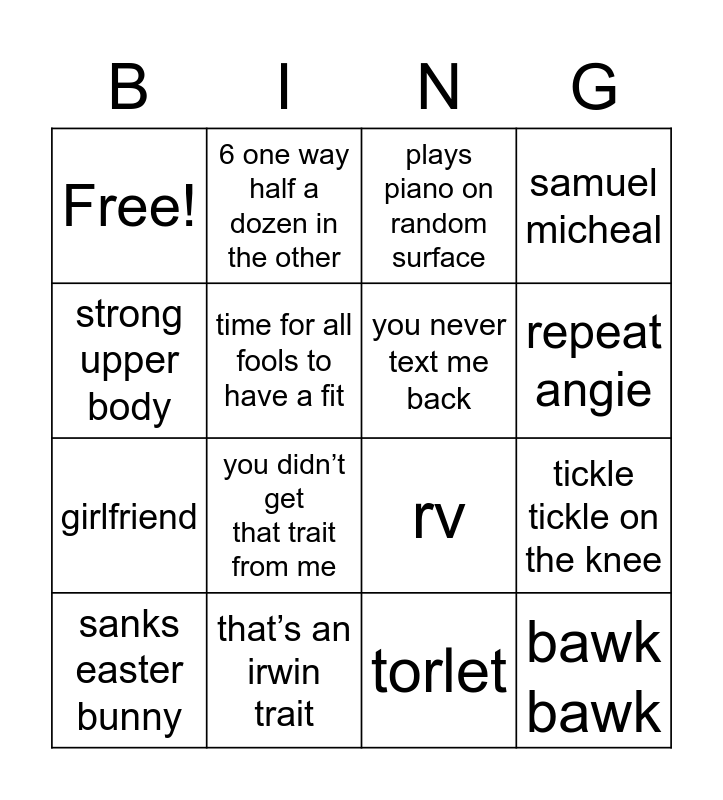This bingo card has 16 words: sanks easter bunny, that’s an irwin trait, plays piano on random surface, samuel micheal, strong upper body, 6 one way half a dozen in the other, rv, tickle tickle on the knee, Free!, time for all fools to have a fit, torlet, repeat angie, girlfriend, you didn’t get that trait from me, you never text me back and bawk bawk.