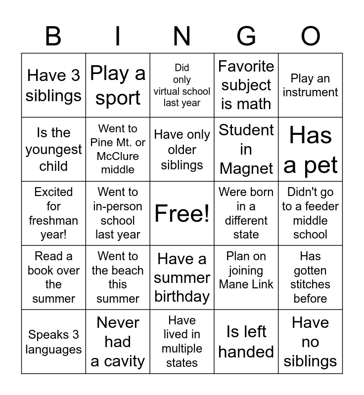 This bingo card has a free space and 24 words: Went to the beach this summer, Never had a cavity, Have only older siblings, Speaks 3 languages, Play an instrument, Have 3 siblings, Is the youngest child, Play a sport, Were born in a different state, Have a summer birthday, Student in Magnet, Excited for freshman year!, Plan on joining Mane Link, Has gotten stitches before, Went to Pine Mt. or McClure middle, Is left handed, Didn't go to a feeder middle school, Did only virtual school last year, Has a pet, Went to in-person school last year, Have no siblings, Read a book over the summer, Favorite subject is math and Have lived in multiple states.
