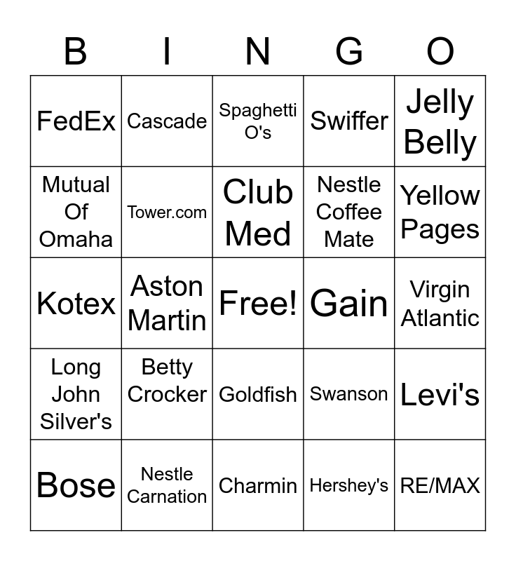 This bingo card has a free space and 49 words: Hamburger Helper, RE/MAX, Dum-Dum Pops, Charmin, Betty Crocker, Nestle Nesquik, Cascade, V8, Mutual Of Omaha, XBOX, Tower.com, Swiffer, Levi's, Swanson, Oster, NHL, Club Med, Gain, Capital One, Jelly Belly, Aston Martin, Hershey's, FedEx, Nestle Coffee Mate, Ocean Spray, Yellow Pages, Bose, Baskin-Robbins, Goldfish, Long John Silver's, MSN, WWF, Thunderbird, Reese's, Nestle Carnation, Campbell's, Volvo, Gap, Virgin Atlantic, Penguin, Ball Park, Microsoft Office, Pantene Pro-V, U-Haul, Kotex, Spaghetti O's, Covergirl, Sunbeam and Ubisoft.