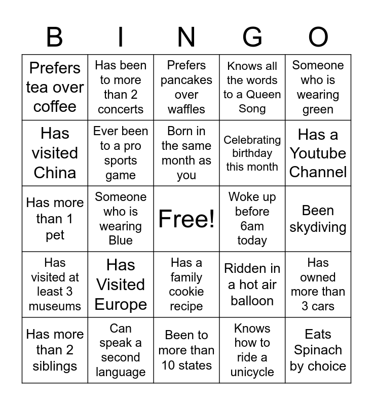This bingo card has a free space and 24 words: Has Visited Europe, Can speak a second language, Born in the same month as you, Has more than 2 siblings, Someone who is wearing green, Prefers tea over coffee, Has visited China, Has been to more than 2 concerts, Woke up before 6am today, Has a family cookie recipe, Celebrating birthday this month, Has more than 1 pet, Ridden in a hot air balloon, Has owned more than 3 cars, Ever been to a pro sports game, Knows how to ride a unicycle, Been skydiving, Prefers pancakes over waffles, Has a Youtube Channel, Someone who is wearing Blue, Eats Spinach by choice, Has visited at least 3 museums, Knows all the words to a Queen Song and Been to more than 10 states.