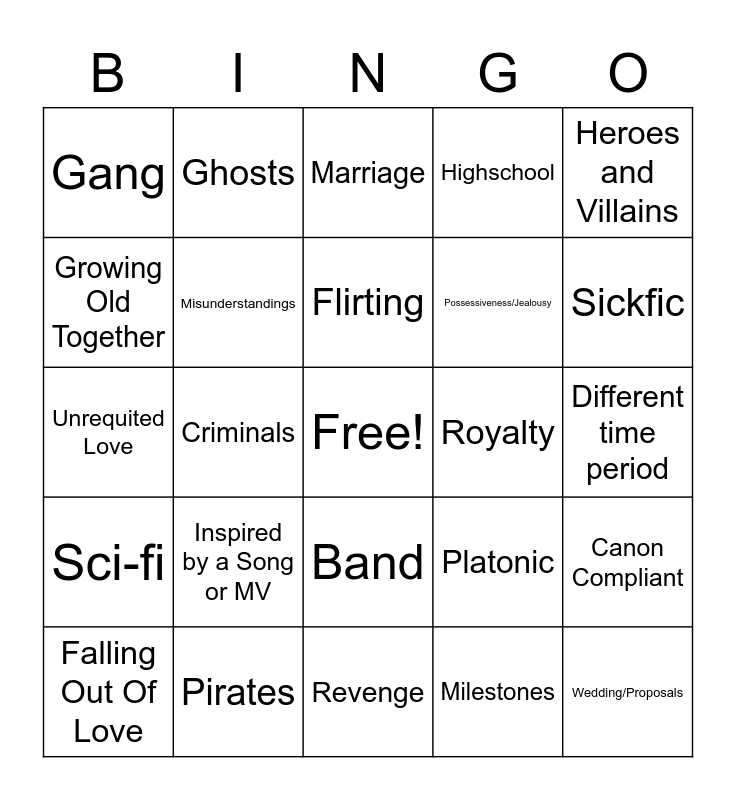 This bingo card has a free space and 24 words: Inspired by a Song or MV, Pirates, Flirting, Falling Out Of Love, Heroes and Villains, Gang, Growing Old Together, Ghosts, Royalty, Band, Possessiveness/Jealousy, Unrequited Love, Platonic, Canon Compliant, Misunderstandings, Milestones, Different time period, Marriage, Sickfic, Criminals, Wedding/Proposals, Sci-fi, Highschool and Revenge.
