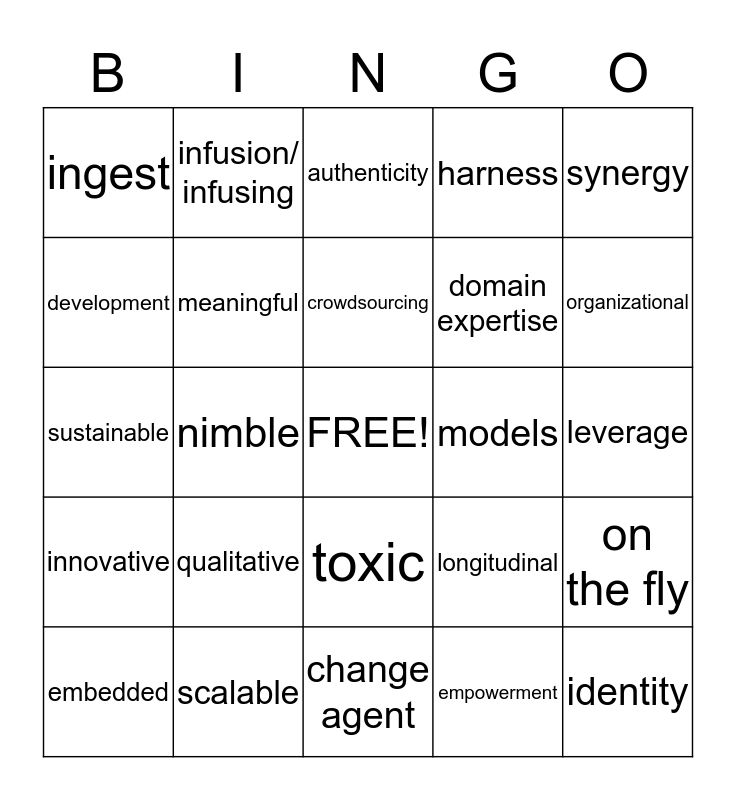 This bingo card has a free space and 33 words: strategic, discovery, nimble, robust, innovative, meaningful, synergy, embedded, infusion/ infusing, leadership, crowdsourcing, authenticity, learning organization, pilot, models, organizational, scalable, sustainable, qualitative, longitudinal, toxic, repository, ingest, leverage, change agent, identity, harness, domain expertise, development, on the fly, organic, empowerment and cybrarian.