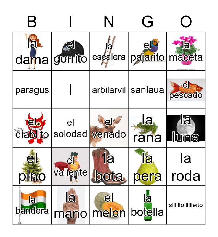 This bingo card has 30 images and 45 words: la campana, el venado, el cazo, la bandera, el barril, la botella, la escalera, el arpa, la maceta, la mano, el pajarito, la rana, la bota, el valiente, el nopal, el melon, la corona, el diablito, el tambor, el pescado, el gorrito, el corazon, la garza, la dama, la sirena, la luna, el musico, la palma, la pera, el pino, el gallo, la roda, el alacraiyo, el crom, la calca, el solodad, arala, ellllllllitos, sllllllolllllleito, arbilarvil, paragus, sanlaua, el munod, l and e.