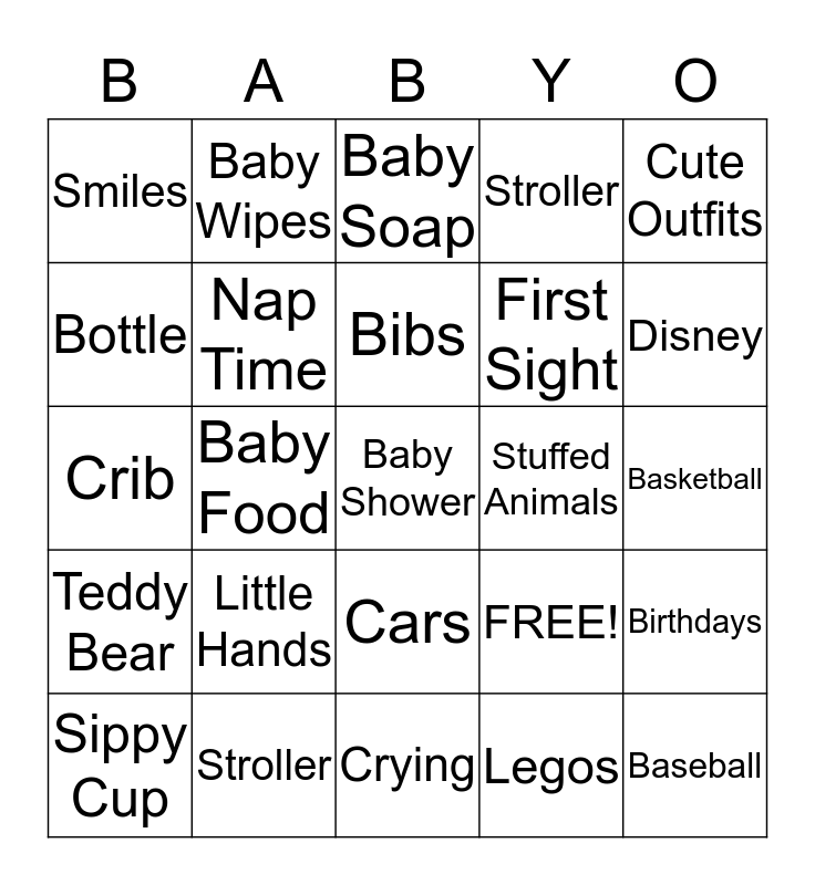 This bingo card has 25 words: Little Hands, Crying, Bibs, Sippy Cup, Cute Outfits, Smiles, Bottle, Baby Wipes, Stuffed Animals, Cars, First Sight, Crib, FREE!, Birthdays, Nap Time, Baseball, Basketball, Baby Soap, Disney, Baby Food, Baby Shower, Stroller, Teddy Bear, Stroller and Legos.