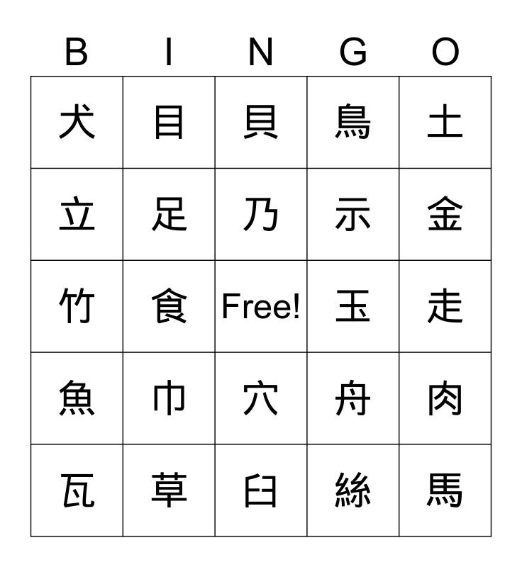 This bingo card has a free space and 25 words: 巾, 臼, 乃, 瓦, 土, 犬, 立, 目, 玉, 穴, 示, 竹, 舟, 肉, 足, 言, 走, 貝, 金, 食, 馬, 草, 魚, 鳥 and 絲.