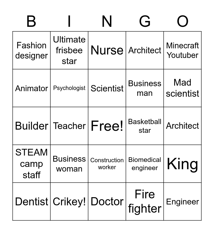 This bingo card has a free space and 24 words: Business woman, Crikey!, Scientist, Dentist, Minecraft Youtuber, Fashion designer, Animator, Ultimate frisbee star, Basketball star, Construction worker, Business man, Builder, Biomedical engineer, King, Psychologist, Fire fighter, Architect, Nurse, Mad scientist, Teacher, Engineer, STEAM camp staff, Architect and Doctor.