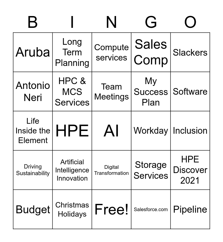 This bingo card has 31 words: Free!, Slack, HPE, Accelerating U, Aruba, Compute services, HPC & MCS Services, Storage Services, Workday, Salesforce.com, Inclusion, AI, Pipeline, Hewlett Packard Enterprise, Software, Ezmeral, HPE Discover 2021, Artificial Intelligence Innovation, Driving Sustainability, Digital Transformation, Slackers, Flash, Budget, Long Term Planning, My Success Plan, Antonio Neri, Sales Comp, Life Inside the Element, Christmas Holidays, Team Meetings and Digital Experience.