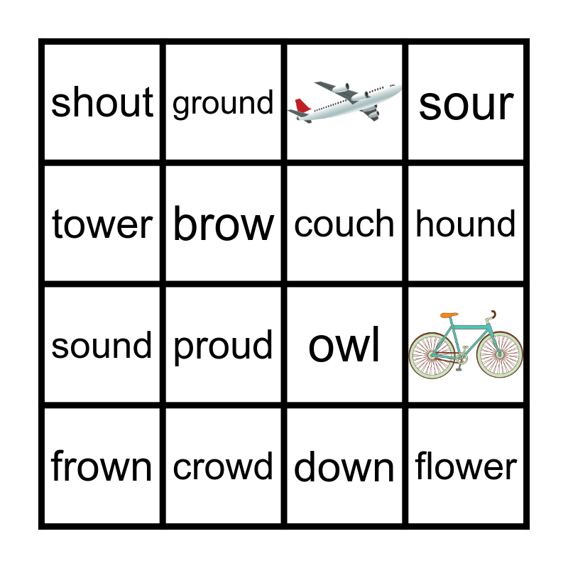 This bingo card has 4 images and 16 words: frown, tower, crowd, shout, sound, ground, proud, owl, brow, flower, couch, loud, hound, sour, down and how.