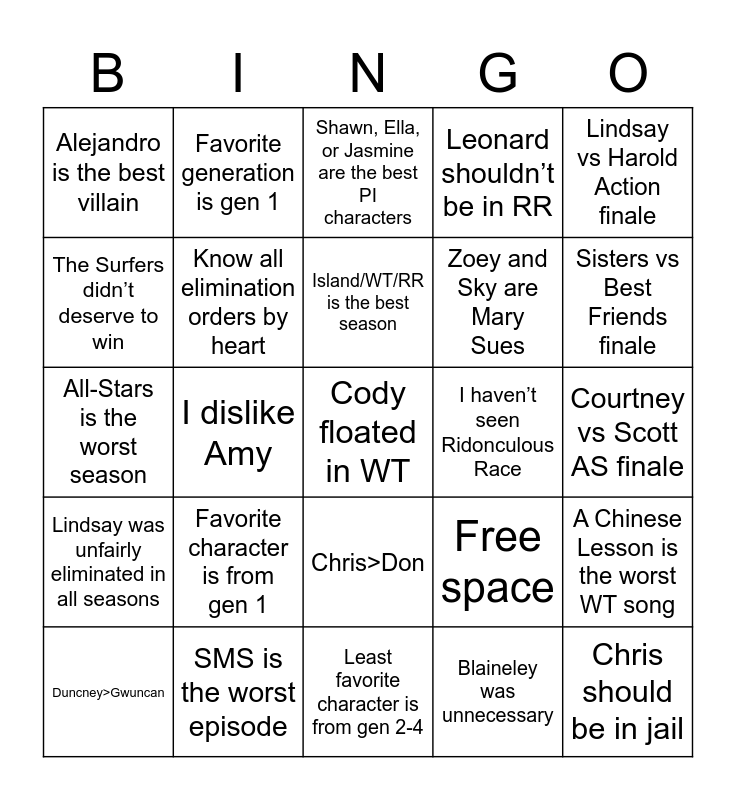This bingo card has 25 words: Favorite character is from gen 1, Least favorite character is from gen 2-4, Island/WT/RR is the best season, Duncney>Gwuncan, Lindsay vs Harold Action finale, Alejandro is the best villain, The Surfers didn’t deserve to win, Favorite generation is gen 1, I haven’t seen Ridonculous Race, Chris>Don, Zoey and Sky are Mary Sues, All-Stars is the worst season, Free space, A Chinese Lesson is the worst WT song, Know all elimination orders by heart, Chris should be in jail, Courtney vs Scott AS finale, Shawn, Ella, or Jasmine are the best PI characters, Sisters vs Best Friends finale, I dislike Amy, Cody floated in WT, SMS is the worst episode, Lindsay was unfairly eliminated in all seasons, Leonard shouldn’t be in RR and Blaineley was unnecessary.