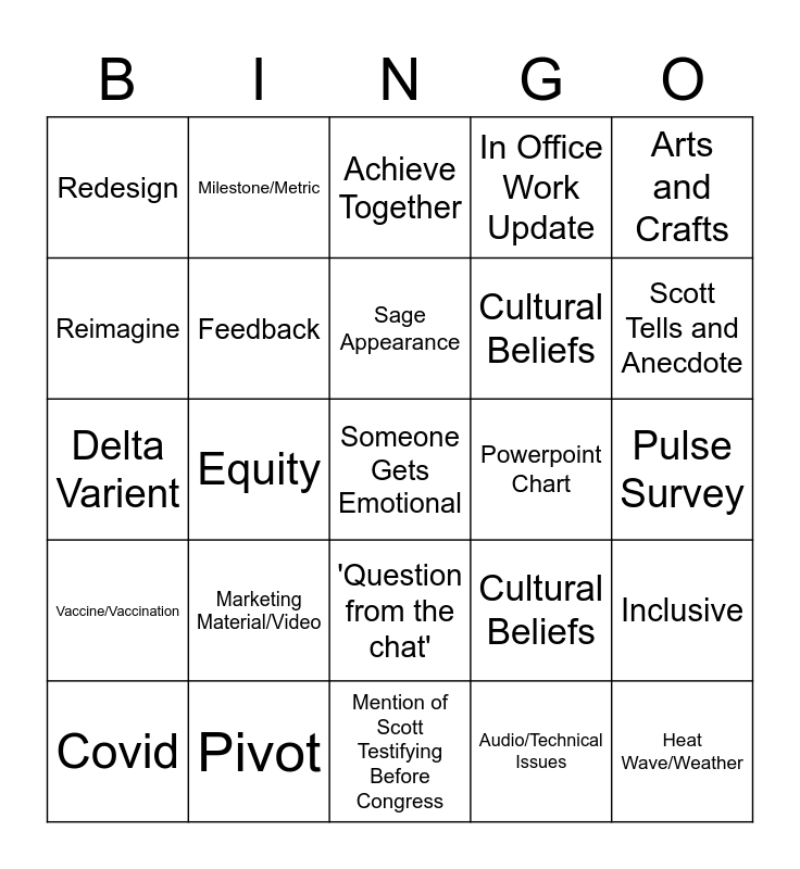 This bingo card has a free space and 24 words: Marketing Material/Video, Pivot, Sage Appearance, Covid, Arts and Crafts, Redesign, Reimagine, Milestone/Metric, Powerpoint Chart, 'Question from the chat', Cultural Beliefs, Delta Varient, Cultural Beliefs, Inclusive, Feedback, Audio/Technical Issues, Pulse Survey, Achieve Together, Scott Tells and Anecdote, Equity, Heat Wave/Weather, Vaccine/Vaccination, In Office Work Update and Mention of Scott Testifying Before Congress.