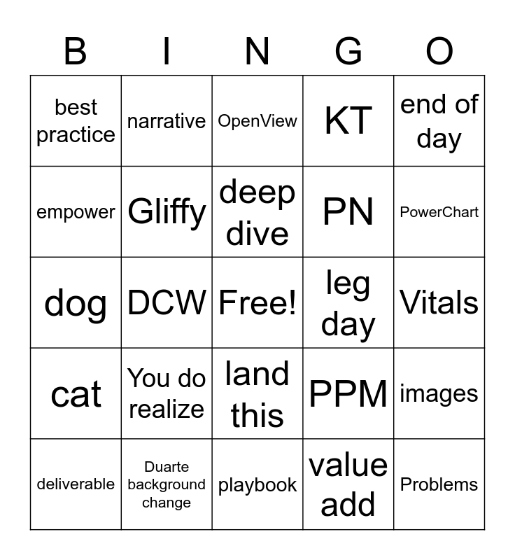 This bingo card has a free space and 25 words: You do realize, playbook, deep dive, deliverable, end of day, best practice, empower, narrative, leg day, land this, PN, dog, PPM, images, Gliffy, finish it up, Vitals, OpenView, PowerChart, DCW, Problems, Duarte background change, cat, KT and value add.