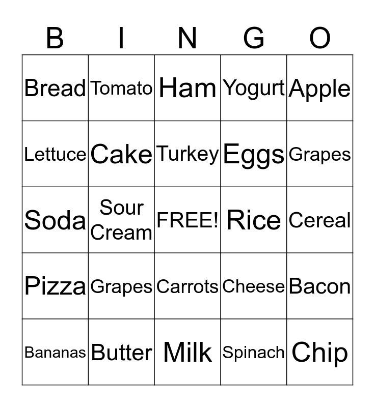 This bingo card has a free space and 24 words: Grapes, Butter, Turkey, Bananas, Apple, Bread, Lettuce, Tomato, Rice, Carrots, Eggs, Soda, Cheese, Bacon, Cake, Spinach, Cereal, Ham, Grapes, Sour Cream, Chip, Pizza, Yogurt and Milk.