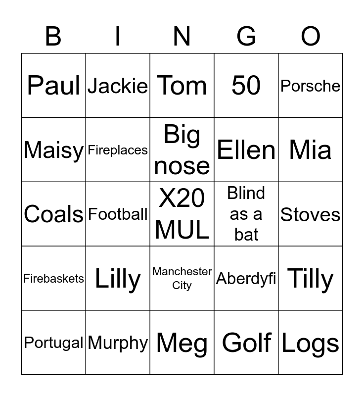 This bingo card has a free space and 24 words: Lilly, Murphy, Big nose, Portugal, Porsche, Paul, Maisy, Jackie, Blind as a bat, Manchester City, Ellen, Coals, Aberdyfi, Tilly, Fireplaces, Golf, Stoves, Tom, Mia, Football, Logs, Firebaskets, 50 and Meg.