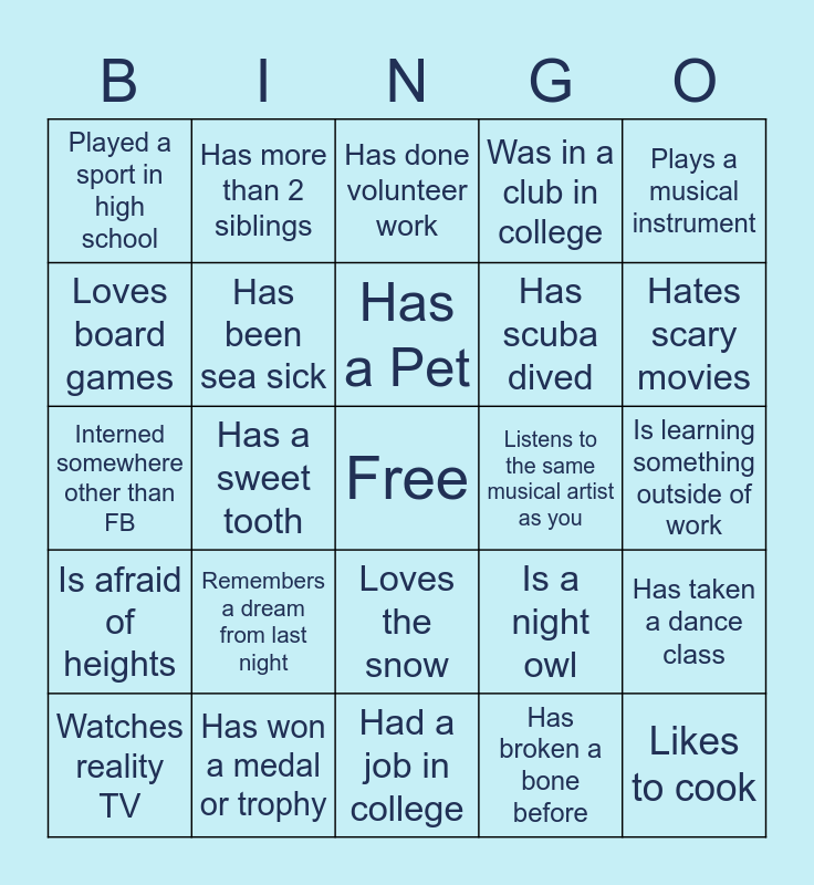 This bingo card has a free space and 24 words: Remembers a dream from last night, Has won a medal or trophy, Has a Pet, Watches reality TV, Plays a musical instrument, Played a sport in high school, Loves board games, Has more than 2 siblings, Listens to the same musical artist as you, Loves the snow, Has scuba dived, Interned somewhere other than FB, Is a night owl, Has taken a dance class, Has been sea sick, Has broken a bone before, Is learning something outside of work, Has done volunteer work, Hates scary movies, Has a sweet tooth, Likes to cook, Is afraid of heights, Was in a club in college and Had a job in college.