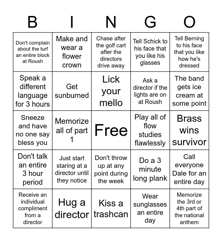 This bingo card has a free space and 39 words: At least 2 people in the section cry during senior stories, The directors get water poured on them, Memorize all pregame music, Get sunburned, Receive an individual compliment from a director, Don't throw up at any point during the week, Lick your mello, Win an event for the brass survivor team, Tell Berning to his face that you like how he's dressed, Don't talk an entire 3 hour period, Memorize all of part 1, Tell Schick to his face that you like his glasses, Memorize the 3rd or 4th part of the national anthem, Brass wins survivor, Play all of flow studies flawlessly, Just start staring at a director until they notice, Give someone a flower, Don't complain about the turf an entire block at Roush, Do 30 pushups, Do a 3 minute long plank, Speak a different language for 3 hours, Kiss a trashcan, Ask a director if the lights are on at Roush, The band gets ice cream at some point, Eat some grass while we do planks, Take a picture of a dead bird, Do a flip lol, The whole section wears their bucket hat together, Bury something of value, Make and wear a flower crown, Go a whole 3 hours without sunglasses or a hat, Be first in line for food, Chase after the golf cart after the directors drive away, Hug a director, Wear sunglasses an entire day, Shake hands with a staff member with the wrong hand, Call everyone Dale for an entire day, Sneeze and have no one say bless you and Find a four leaf clover.