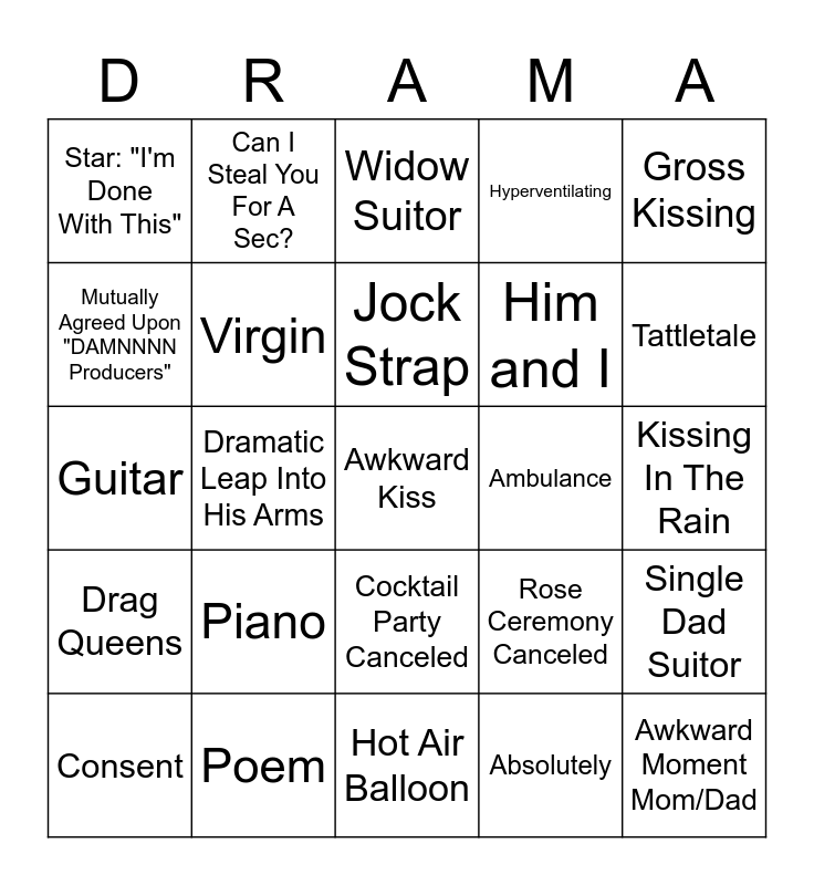 This bingo card has a free space and 34 words: That Being Said, Absolutely, Journey, Here For The Right Reasons, Drag Queens, Virgin, Gross Kissing, Consent, Can I Steal You For A Sec?, I Feel A Connection, Jock Strap, Widow Suitor, Dramatic Boot From The House, Injury, Ambulance, Tattletale, Poem, Guitar, Piano, Rose Ceremony Canceled, Cocktail Party Canceled, My Worst Fear, Star: "I'm Done With This", Kissing In The Rain, Hot Air Balloon, Awkward Moment Mom/Dad, Hyperventilating, Her and I, Him and I, Mutually Agreed Upon "DAMNNNN Producers", Wells the Bartender, Dramatic Leap Into His Arms, Single Dad Suitor and Time Cop With A Rose.