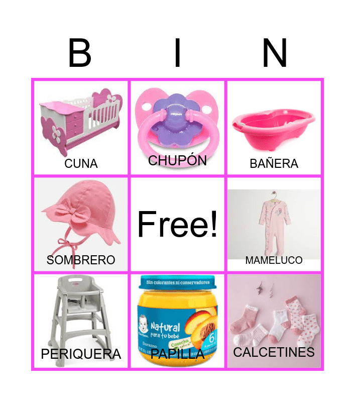 This bingo card has 14 images, a free space and 14 words: MAMILA, PAÑALERA, MAMELUCO, CUNA, BAÑERA, SOMBRERO, POMADA, TALCO, PAÑAL, CHUPÓN, CALCETINES, PERIQUERA, PAPILLA and SILLA.