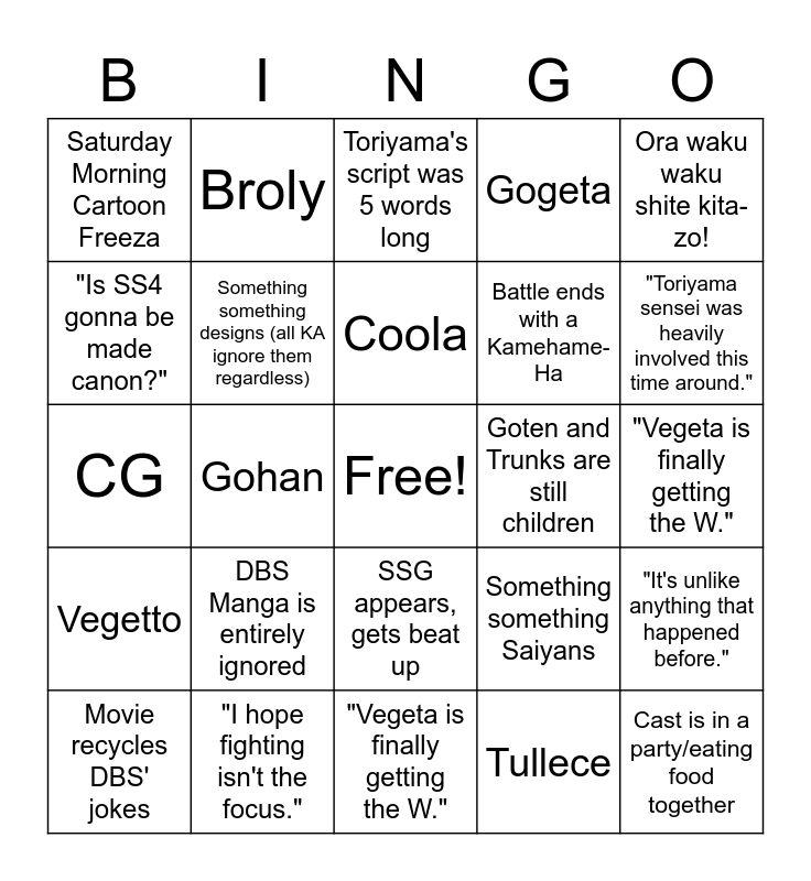 This bingo card has a free space and 24 words: DBS Manga is entirely ignored, "I hope fighting isn't the focus.", Coola, Movie recycles DBS' jokes, Ora waku waku shite kita-zo!, Saturday Morning Cartoon Freeza, "Is SS4 gonna be made canon?", Broly, Goten and Trunks are still children, SSG appears, gets beat up, Battle ends with a Kamehame-Ha, CG, Something something Saiyans, "It's unlike anything that happened before.", Something something designs (all KA ignore them regardless), Tullece, "Vegeta is finally getting the W.", Toriyama's script was 5 words long, "Toriyama sensei was heavily involved this time around.", Gohan, Cast is in a party/eating food together, Vegetto, Gogeta and "Vegeta is finally getting the W.".