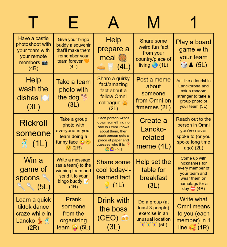 This bingo card has 25 words: Win a game of spoons ๐ฅ๐ฅ๐ฅ (5L), Prank someone from the organizing team ๐คช (5L), Each person writes down something no one in Omni knows about them, then each person gets a piece of paper and guesses who it is โ๐โโ๏ธ๐โโ๏ธ (5L), Do a group (at least 3 people) exercise in an unusual location ๐๏ธโโ๏ธ๐๏ธโโ๏ธ๐๏ธโโ๏ธ (5L), Play a board game with your team ๐ฒโ (5L), Have a castle photoshoot with your team with your remote members ๐ท (4R), Give your bingo buddy a souvenir that'll make them remember your team forever ๐งก (4L), Help prepare a meal ๐ฅ๐ฅง๐ฅ (4L), Create a Lancko-related meme (4L), Come up with nicknames for every member of your team and wear them on nametags for a day ๐ (4R), Help wash the dishes ๐ฝ (3L), Take a team photo with the dog ๐ (3L), Drink with the boss (CEO) ๐ป (3L), Help set the table for breakfast (3L), Act like a tourist in Lanckorona and ask a random stranger to take a group photo of your team (3L), Learn a quick tiktok dance craze while in Lancko ๐๐บ (2R), Take a group photo with everyone in your team doing a funny face ๐๐ฅด๐ (2R), Share a quirky fact/amazing fact about a fellow Omni colleague ๐ (2L), Post a meme about someone from Omni on #memes (2L), Reach out to the person in Omni you've never spoke to (or you spoke long time ago) (2L), Rickroll someone ๐บ (1L), Write a message (as a team) to the winning team and send it to your bingo buddy ๐ (1R), Share some cool today-I-learned fact ๐ก (1L), Share some weird fun fact from your country/place of living ๐ (1L) and Write what Omni means to you (each member) in 1 line ๐ฅฐ (1R).