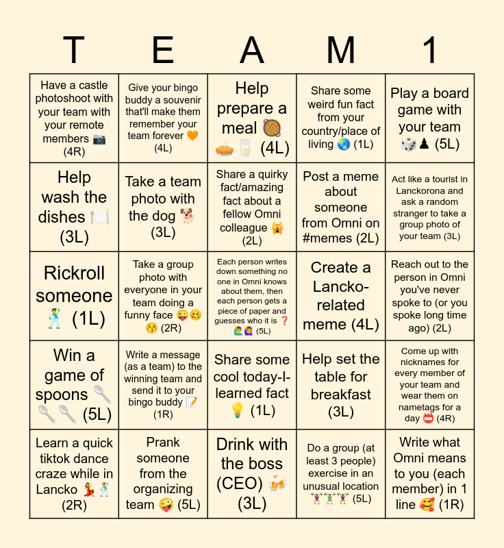 This bingo card has 25 words: Win a game of spoons ๐ฅ๐ฅ๐ฅ (5L), Prank someone from the organizing team ๐คช (5L), Each person writes down something no one in Omni knows about them, then each person gets a piece of paper and guesses who it is โ๐โโ๏ธ๐โโ๏ธ (5L), Do a group (at least 3 people) exercise in an unusual location ๐๏ธโโ๏ธ๐๏ธโโ๏ธ๐๏ธโโ๏ธ (5L), Play a board game with your team ๐ฒโ (5L), Have a castle photoshoot with your team with your remote members ๐ท (4R), Give your bingo buddy a souvenir that'll make them remember your team forever ๐งก (4L), Help prepare a meal ๐ฅ๐ฅง๐ฅ (4L), Create a Lancko-related meme (4L), Come up with nicknames for every member of your team and wear them on nametags for a day ๐ (4R), Help wash the dishes ๐ฝ (3L), Take a team photo with the dog ๐ (3L), Drink with the boss (CEO) ๐ป (3L), Help set the table for breakfast (3L), Act like a tourist in Lanckorona and ask a random stranger to take a group photo of your team (3L), Learn a quick tiktok dance craze while in Lancko ๐๐บ (2R), Take a group photo with everyone in your team doing a funny face ๐๐ฅด๐ (2R), Share a quirky fact/amazing fact about a fellow Omni colleague ๐ (2L), Post a meme about someone from Omni on #memes (2L), Reach out to the person in Omni you've never spoke to (or you spoke long time ago) (2L), Rickroll someone ๐บ (1L), Write a message (as a team) to the winning team and send it to your bingo buddy ๐ (1R), Share some cool today-I-learned fact ๐ก (1L), Share some weird fun fact from your country/place of living ๐ (1L) and Write what Omni means to you (each member) in 1 line ๐ฅฐ (1R).