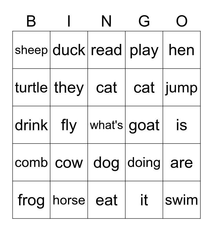 This bingo card has a free space and 24 words: cow, horse, cat, frog, hen, sheep, turtle, duck, goat, dog, cat, drink, doing, are, they, it, is, read, jump, fly, swim, comb, play and eat.